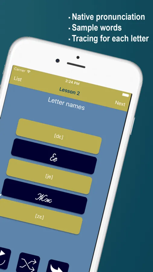 For each letter you will hear the letter name, the pronunciation and a sample word. Start learning your first vocabulary as you learn the letters!