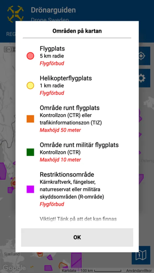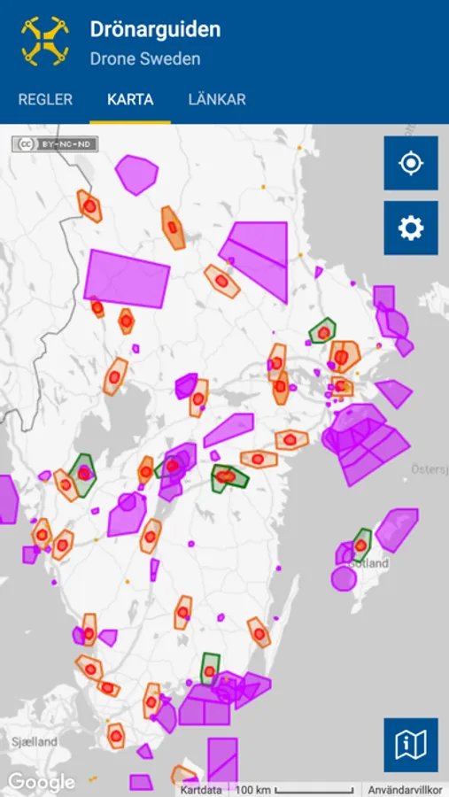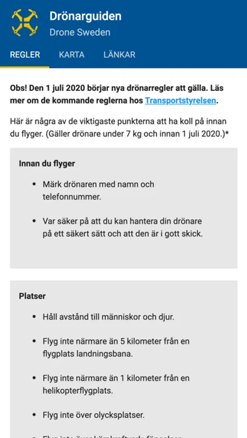 Appen innehåller en sammanställning av de regler och rekommendationer som finns gällande drönare. En drönarkarta visar olika flygzoner och vart man får flyga. Inkluderat är även en ordbok med vanliga ord och termer från drönarvärlden.
