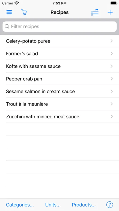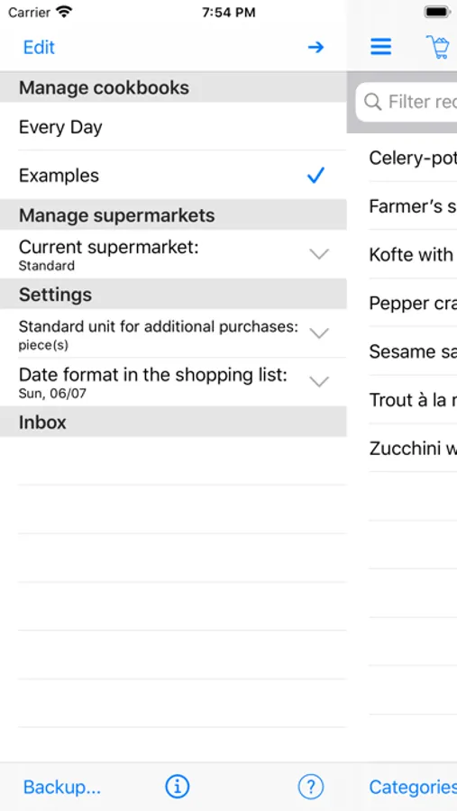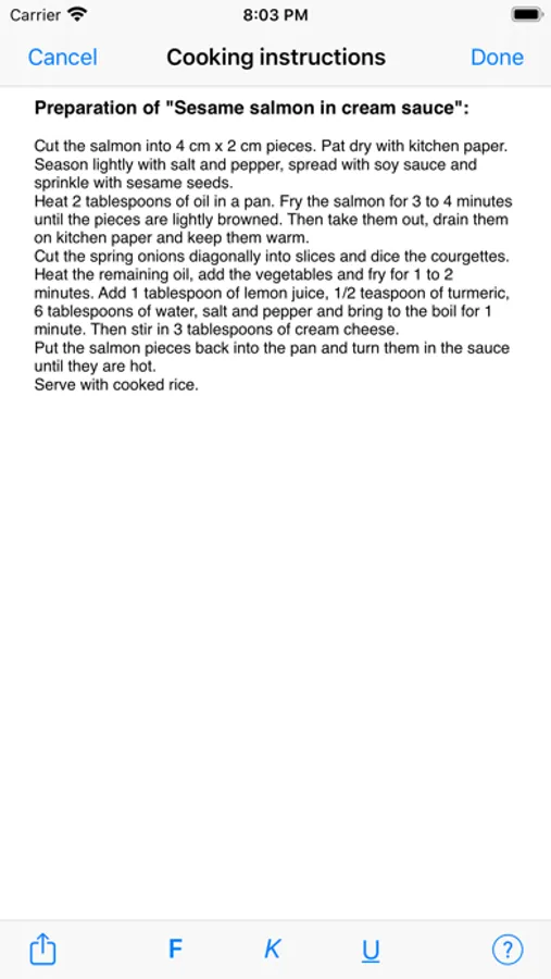 The cookbooks with recipes can be freely created and edited. An integrated internet browser allows imports from web portals with recipes. Cookbooks can be exchanged via e-mail, messages or AirDrop with other iOS devices on which the app is installed.