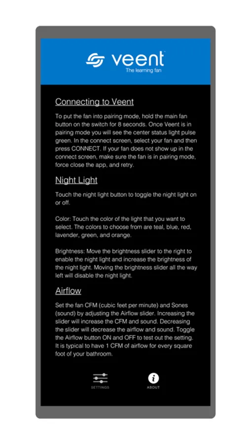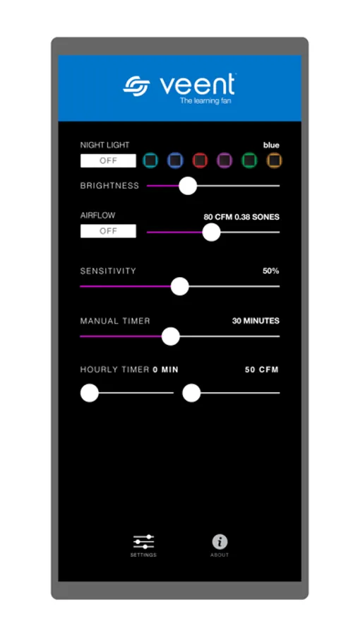 The Veent app allows you to set your controlled moisture level, control and customize your six color night light, adjust your fan speed, sound level and set your manual and hourly timer. Simply choose your preferences and let your Veent do the rest.