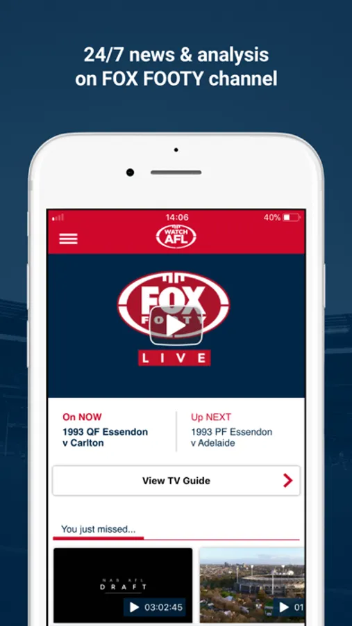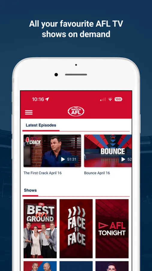 Watch AFL brings you all the action you love including the 2018 Toyota AFL Premiership Season & Finals Series LIVE and on demand, with loads of new features that put you in control. Plus watch all the NAB 2018 Women's Competition, the full JLT Pre Season competition and the new AFLX Series.