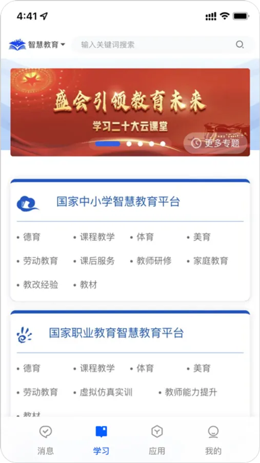 国家智慧教育公共服务平台(Smart Education of China)是国家教育公共服务的综合集成平台,通过整合各级各类教育平台入口,汇聚政府、学校和社会的优质资源、服务和应用,聚焦学生学习、教师教学、学校治理、赋能社会、教育创新等五大核心功能,一体谋划基础教育、职业教育、高等教育三大基础板块,全面覆盖德育、智育、体育、美育、劳动教育,为师生、家长和社会学习者提供“一站式”服务。努力成为学生学习与交流的平台、教师教育教学与备课交流的平台、学校科学治理的平台、社会教育与服务的平台、推动教育改革发展研究的平台。目标定位是全国师生学习交流的第一门户,中国教育的国际名片。