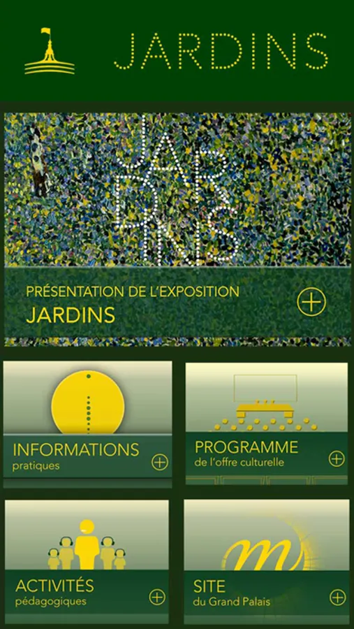 L'application «Jardins» est l’Application officielle de l’exposition qui se tient à Paris, au Grand Palais, du 15 mars 2017 au 24 juillet 2017. Elle vous propose: des informations pratiques sur et autour de l'exposition, des explications sur le sujet. Mais aussi un parcours gratuit de découverte botanique de 12 œuvres et des parcours audioguidés en achats intégrés.