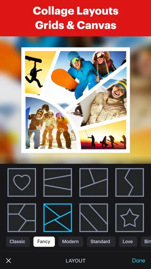 An extensive selection of over 1000 collage layouts. All popular canvas, trendy shapes and fonts.