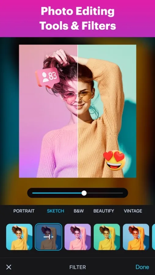 Add unique filters to your photos to create different moods and styles. Choose vintage or sepia to make your photos more atmosphere.