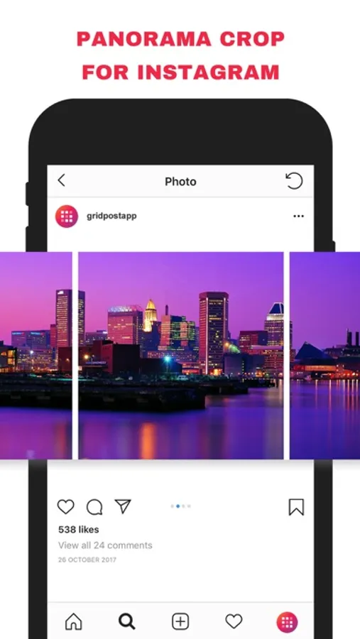 Photo Grid allows you to create swipeable post for instagram. Crop large panorama images into number of square pieces and upload to instagram with Instagram's new carousel album feature. Panorama crop is the best and fast swipeable app for instagram. Just select photo from gallery than choose number of square pieces and now all pieces are ready for upload.