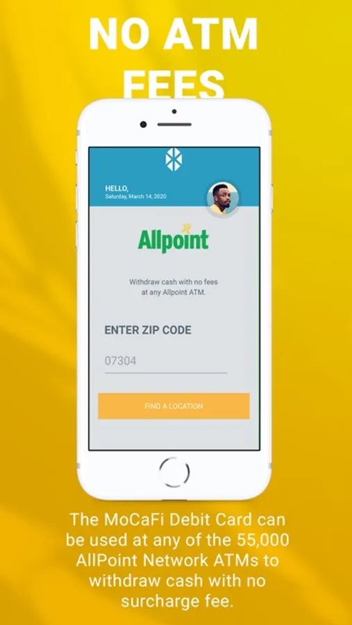 The MoCaFi Debit Card can be used at any of the 55,000 AllPoint Network ATMs to withdraw cash with no surcharge fee. Just look for the AllPoint logo or use the ATM locator in the MoCaFi app.