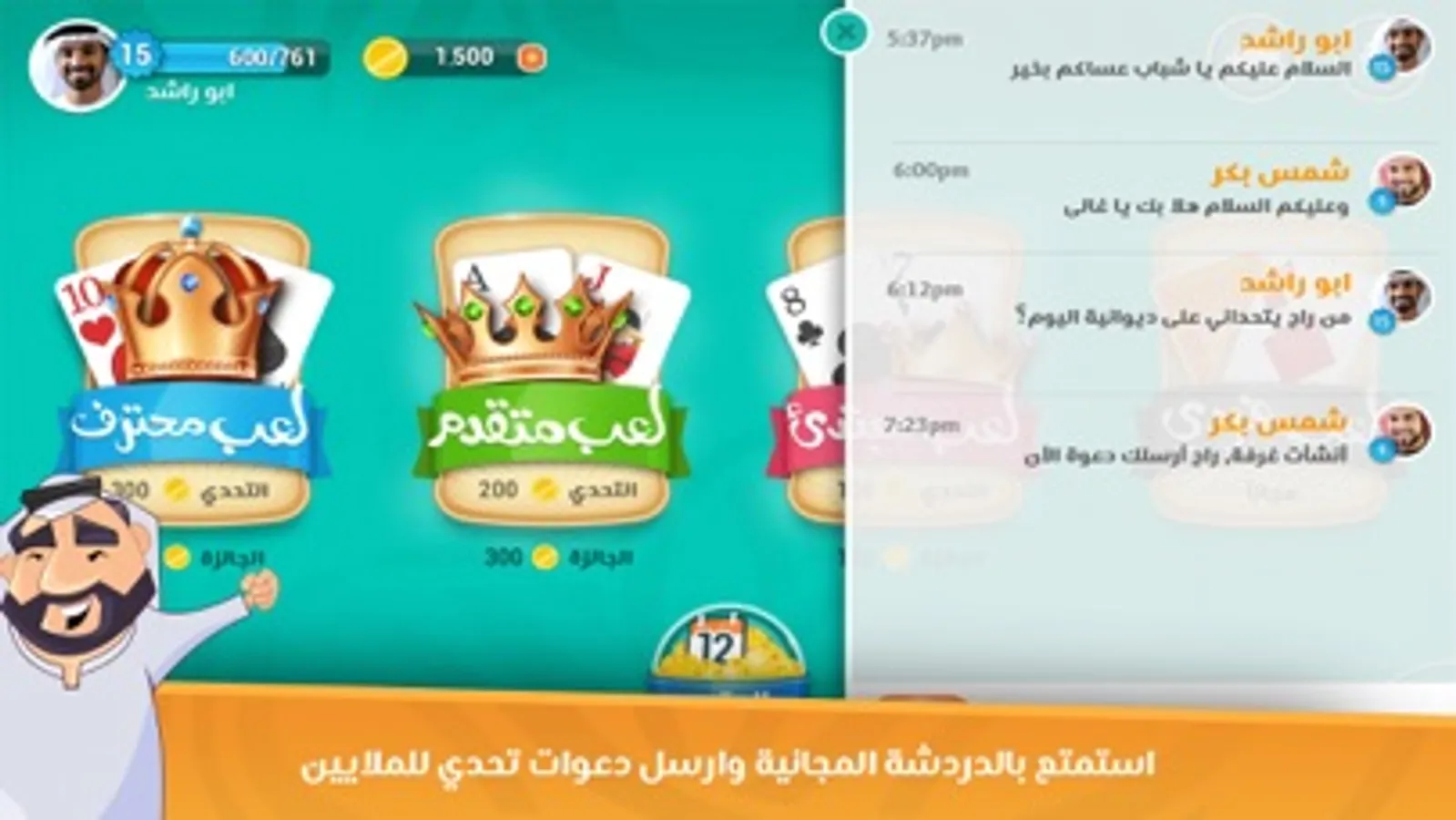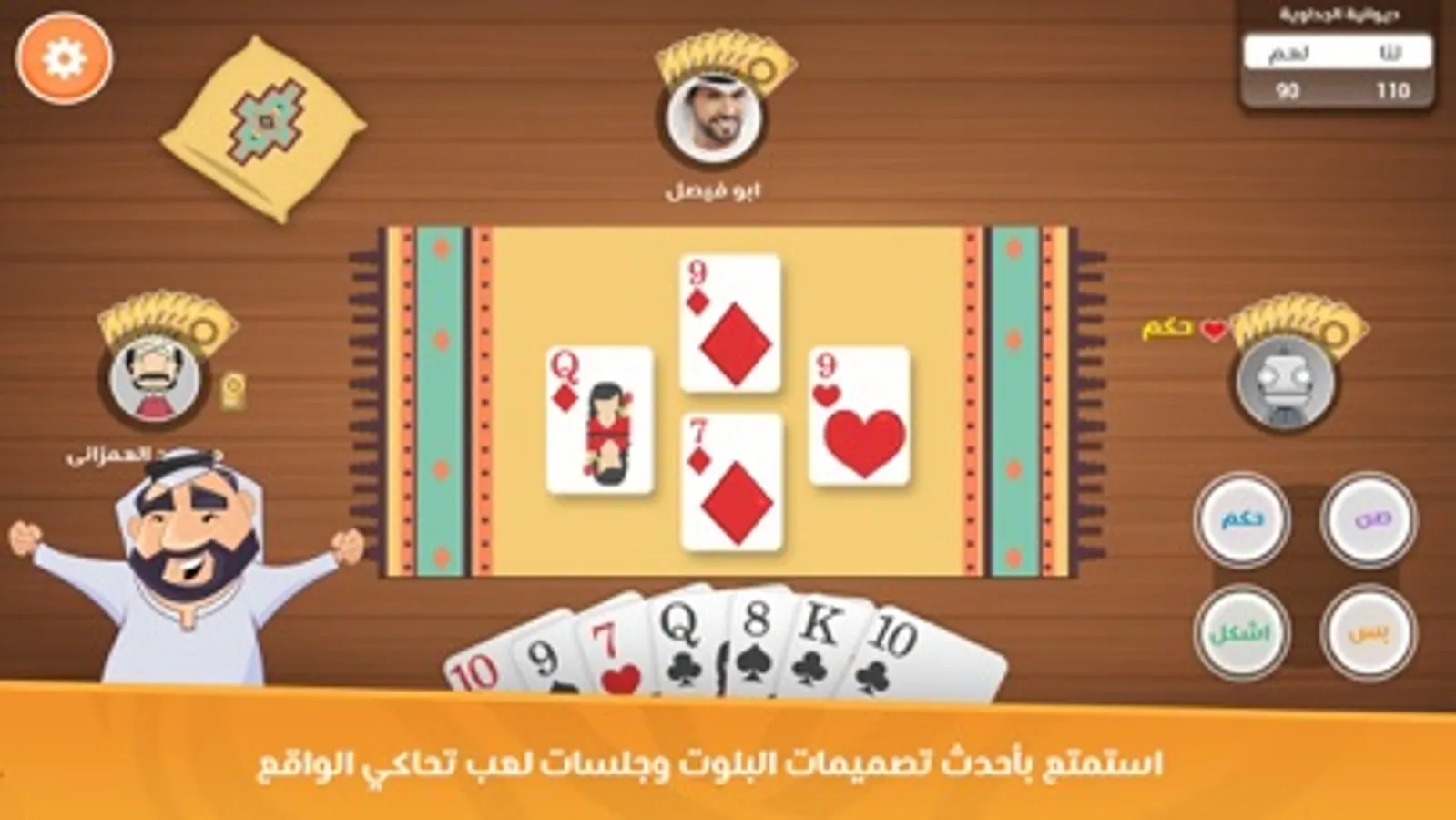 استمتع بأكثر من مستوى للعب البلوت "مبتدئ - متقدم - محترف" وسولف مع عباقرة البلوت وكوّن صداقات وادعهم ليلعبوا معك في ديوانيتك الخاصة.