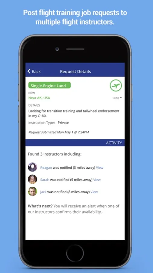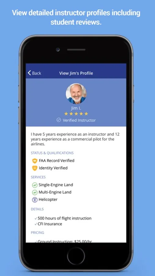 Pilots can search and compare local flight instructors or post their training needs, all for free. Search for your instructor in fixed wing, rotor wing, glider, drone, and lighter-than-air categories; whether seeking initial training, additional ratings, flight review, or something more specific. Review detailed flight instructor profiles and reviews. Easily communicate and book your next lesson. Once your training is complete, send secure payments, and leave your own instructor review regarding your experience.
