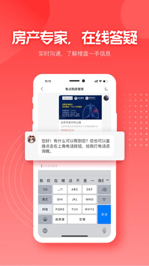 【焦点好房】提供聊天服务,无论是房产专家、置业顾问、房产经纪人、家装设计师、装修工长,还是一同准备买房的房友,随时随地可以聊天沟通