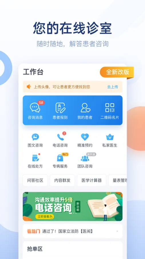 更多患者选择足不出户线上问诊,可为患者提供图文、包月、电话咨询服务。