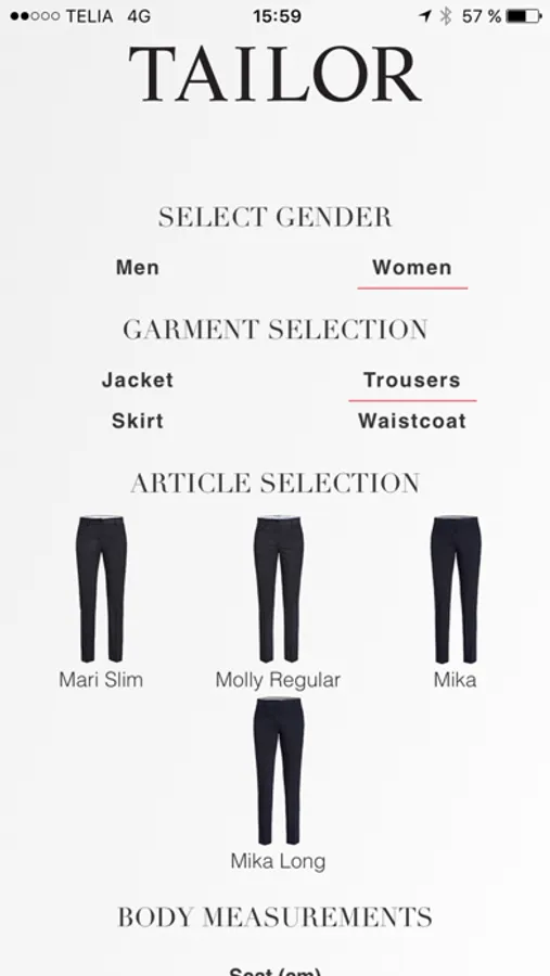 Enter a few body measurements and receive size suggestions in return. From the first design sketch to the point of production. We leave nothing to a mere roll of the dice. And thats´s why we provide this app to ensure best fit to end customers!