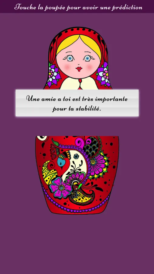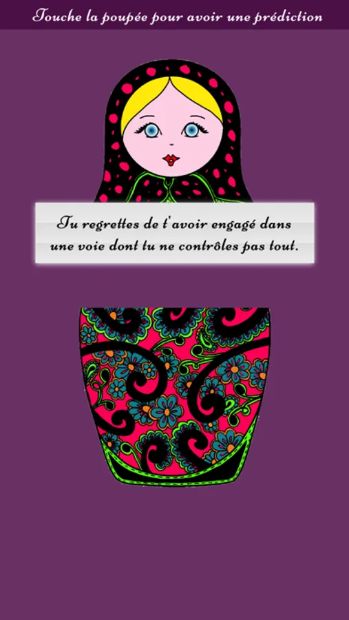 Grâce au pouvoir de la voyance et la poupée les prédictions seront toujours exactes ! Il suffit simplement d'ouvrir la poupée russe affiché pour obtenir votre futur, Amour, Travail, Ami(e)s, Argent.... Tout les thèmes qui vous correspondent sont représentés !
