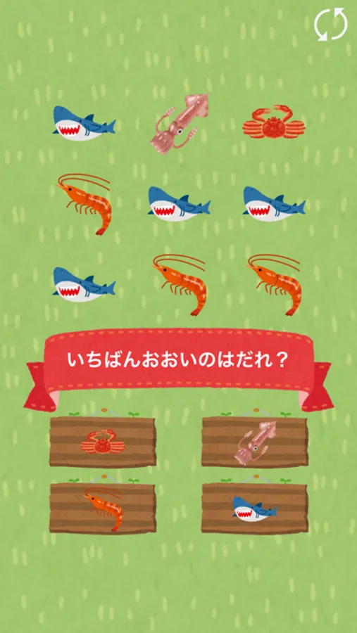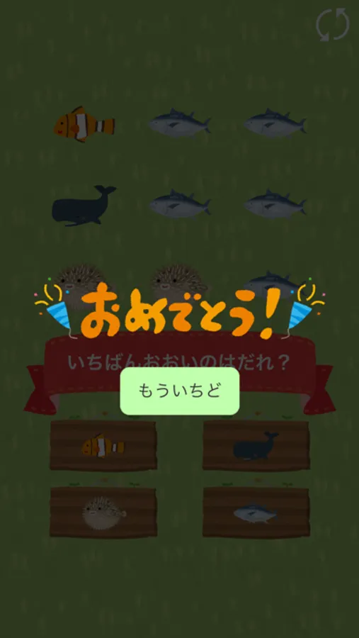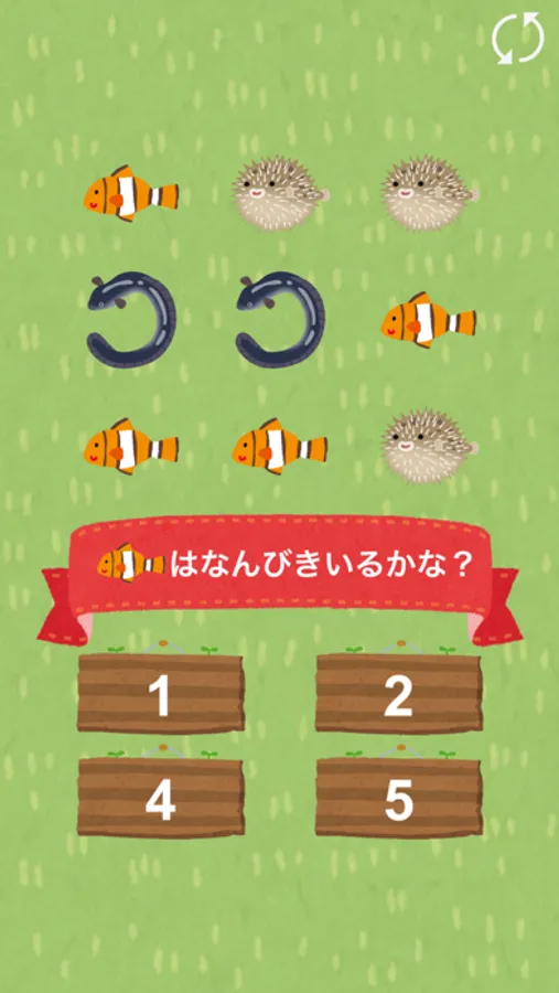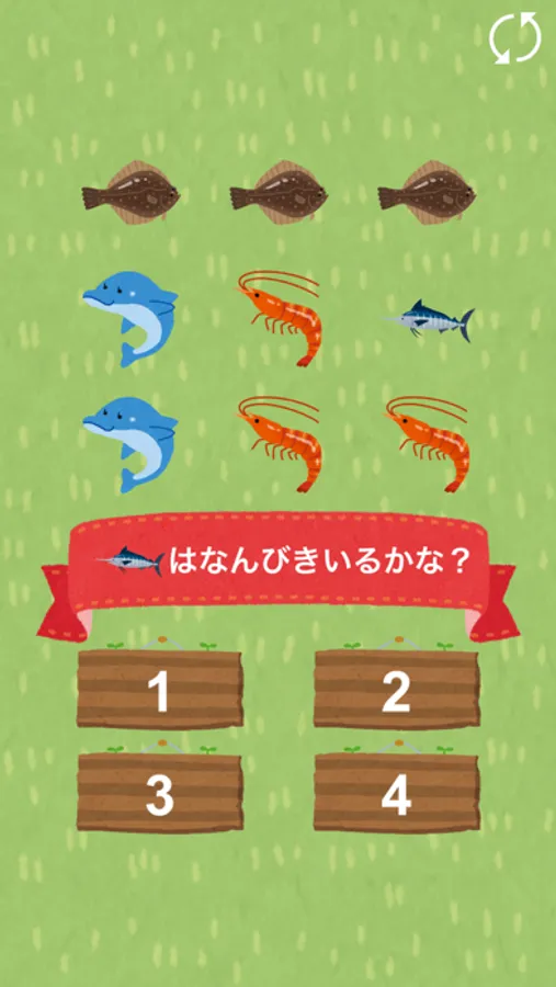 画面内のお魚を数えて何匹いるか?どのお魚がいちばん多いか?を答えるクイズです。