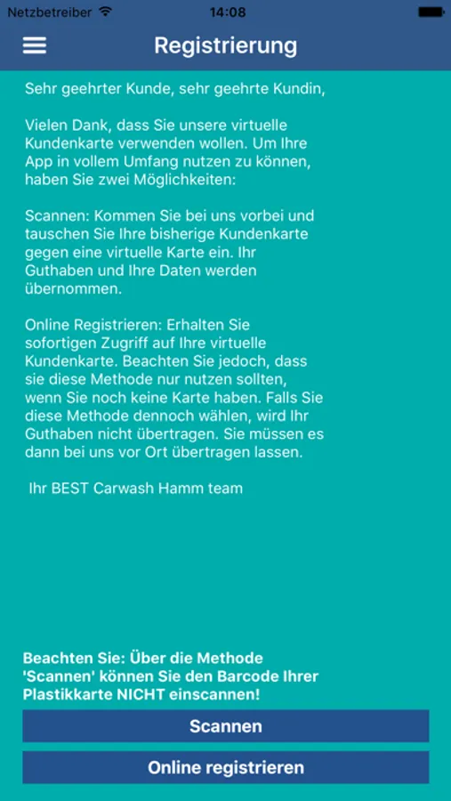 Um die App als Kundenkarte freizuschalten, melden Sie sich an unserer Kasse und scannen Sie einmal einen Beleg (NICHT Ihre bisherige Plastikkarte, sofern Sie bereits über eine Karte verfügen). Und sofort können Sie Ihre Karte nutzen. Wenn Sie bereits Besitzer einer BESTcard Hamm sind, dann bringen Sie sie mit und wir übernehmen das Guthaben direkt.