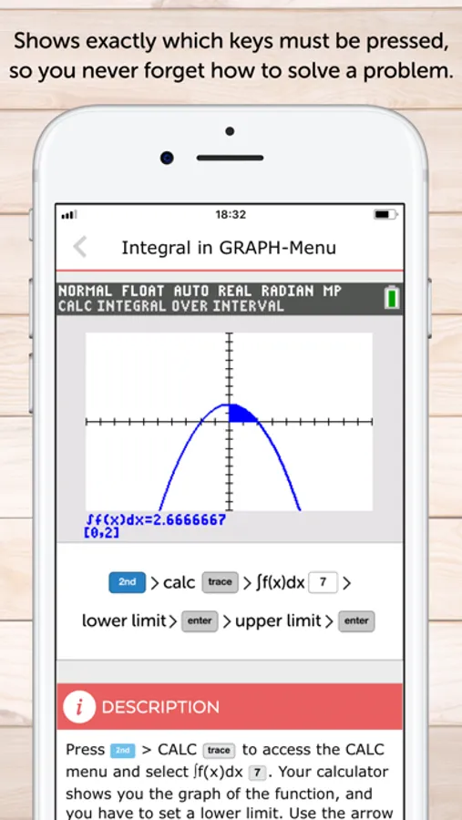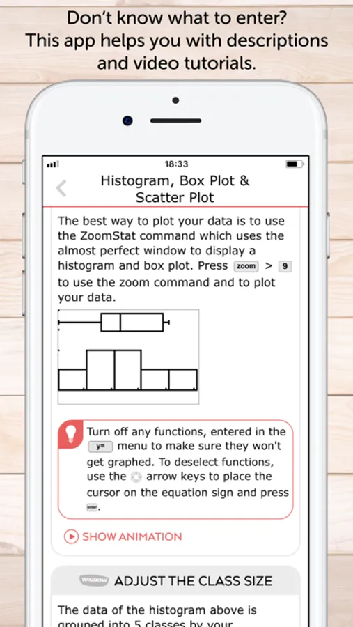 • You can swipe through screenshots of the original graphing calculator which show every steps you have to do (220 screenshots in total) or watch small animations to see how it works on the TI-84 CE!