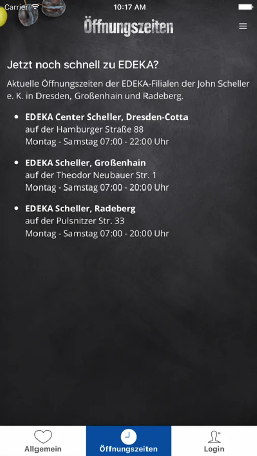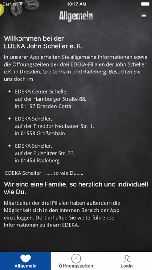 In unserer App erhalten Sie allgemeine Informationen sowie die Öffnungszeiten der drei EDEKA-Filialen der John Scheller e.K. in Dresden, Großenhain und Radeberg.