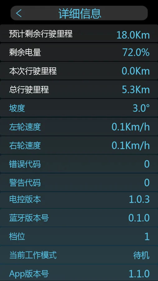 本软件是一款智能轮椅车APP。可以通过APP读取到轮椅车的详细信息,如左右轮速度、坡度、电量、剩余里程等。也可以通过APP来设置轮椅车的参数,如设置档位、设置转向灵敏度和设置行驶灵敏度。还可以通过蓝牙遥控功能来控制轮椅车的移动。