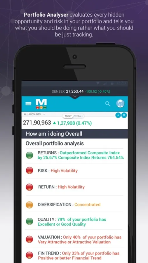 The Portfolio Analyser evaluates every hidden opportunity and risk in the portfolio and tells the investor what he should be doing rather than what he should be just tracking. Every portfolio goes through our test of seven parameters