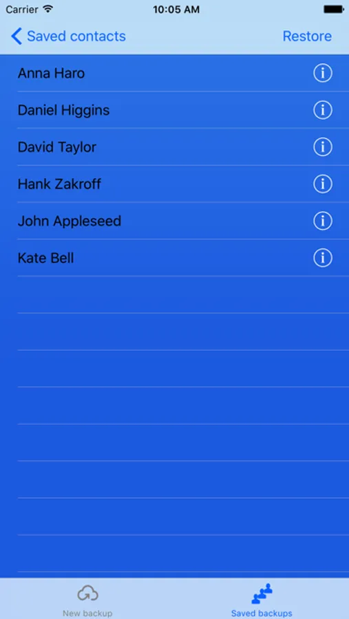 You can restore single or multiple contacts from any backup through the app interface, or do it by using saved backup from your E-mail or iCloud.