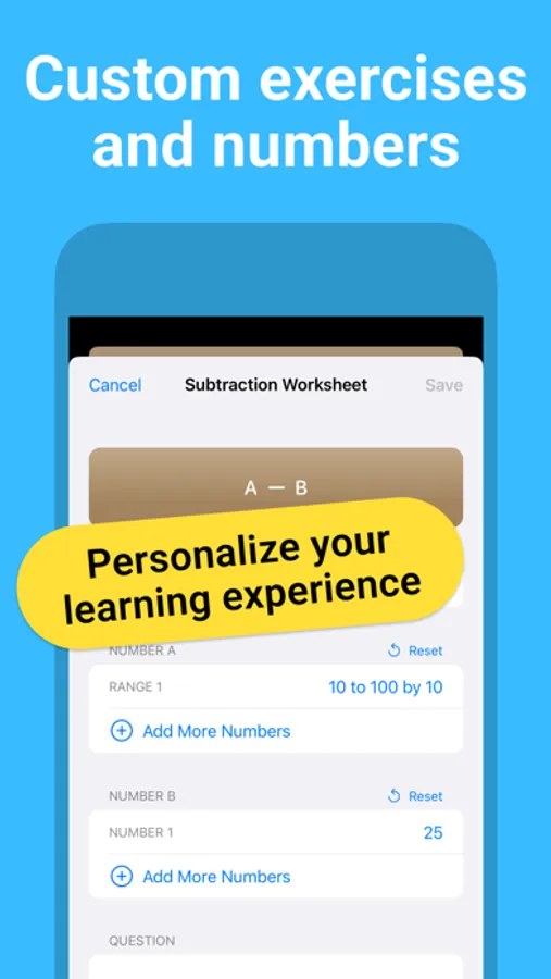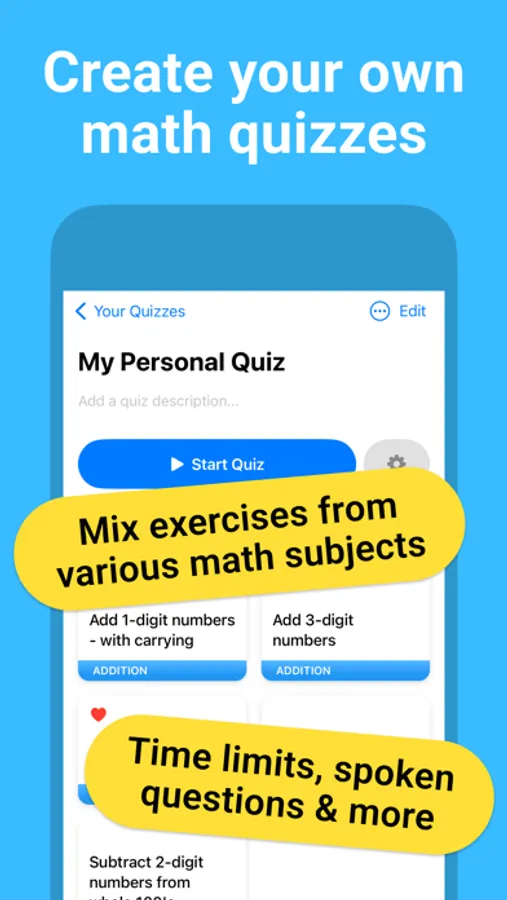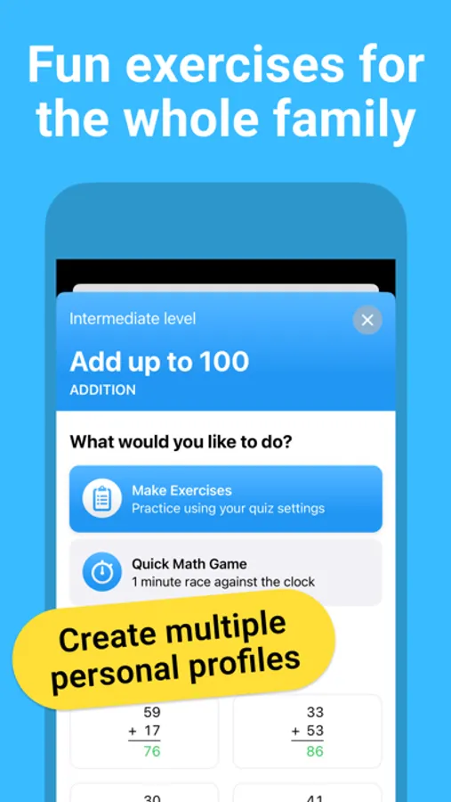 Get everything you need to become better at math. Create your own quizzes and custom exercises. Personalize your learning experience and master math skills at your own pace. Track your progress and enjoy the benefits of improved calculation skills.