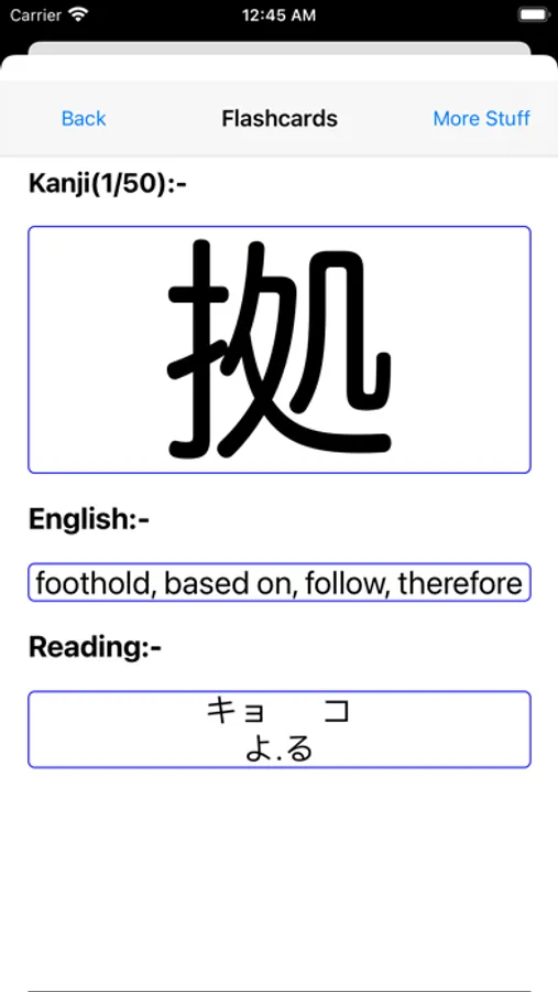 - The app remembers the last kanji you studied, so that you could continue studying where you left off. This is useful in case the app had to reload after returning to it after some time of not using it.