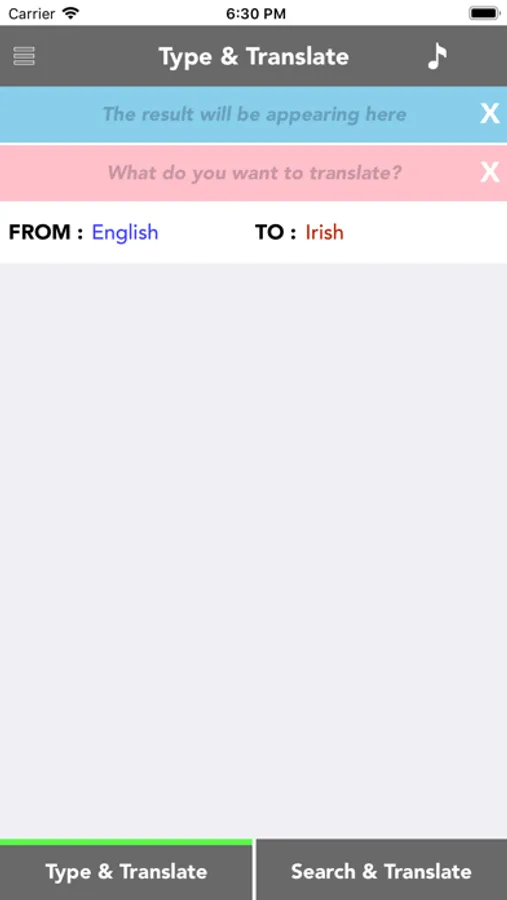 Look up default English to Irish or Irish to English sentences and phrases or manually type your own English to Irish or Irish to English words and sentences with a few clicks.