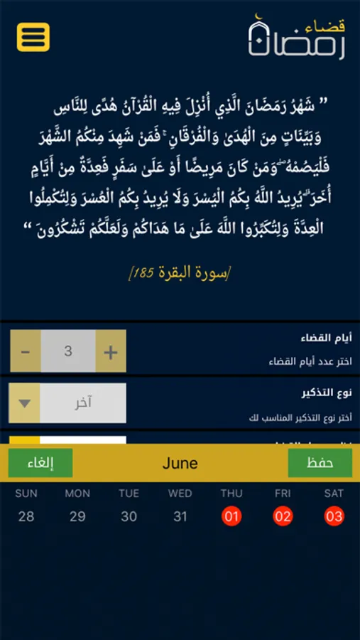 -من خلال الإنتقال إلى صفحة إدخال المعلومات يوجد 3 خانات – الخانة الأولى عبارة عن عدد الأيام المطلوبة لقضاء صوم رمضان والخانة الثانية للإختيار بالتذكير بين التذكير اليومي أو تذكير آخر وهو يمكن تحديد الأيام المطلوب قضائها بتحديد أيام الأسبوع ومن ثم إختيار التكرار إذا كان هناك تذكير متكرر لنفس الأيام خلال الشهر أو في حال قضاء صيام الأيام البيض أو يومين الأثنين والخميس من كل أسبوع.
