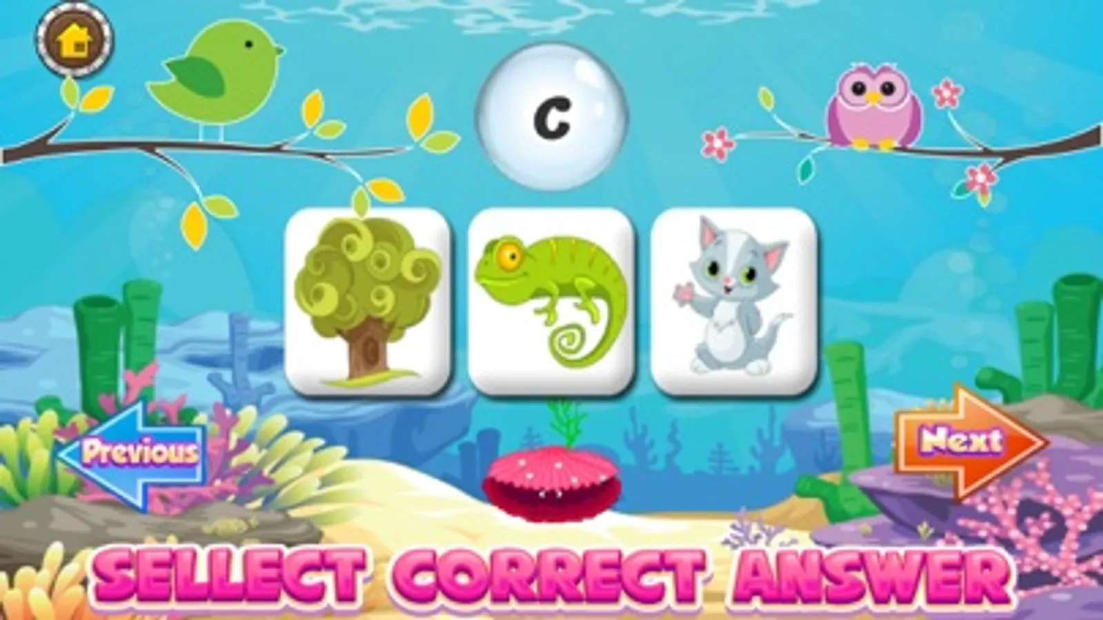 * Find the Correct Image - Kids are asked to choose which item among 3 items that its first letter is the same as the given letter. As for example, given letter A, and there are 3 items: apple, bunglon, and banana. If kids click the “Apple” item, it will be correct, otherwise it will be wrong!