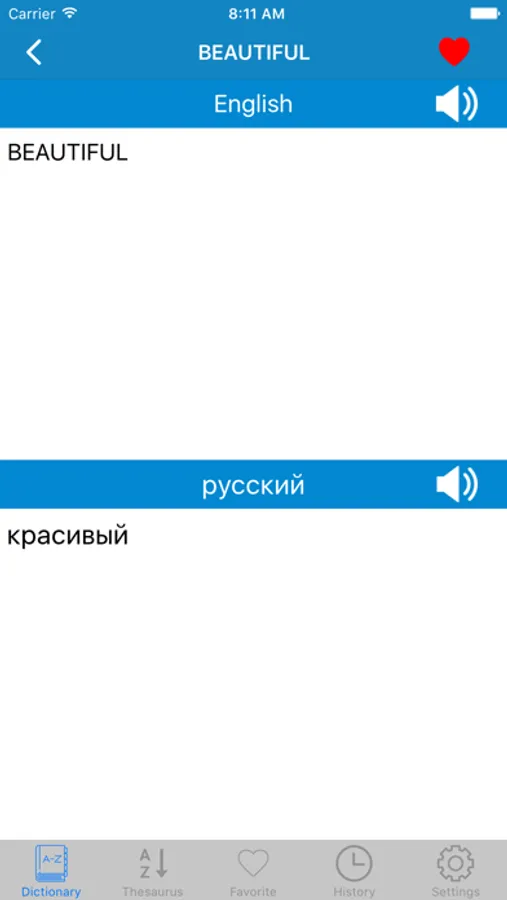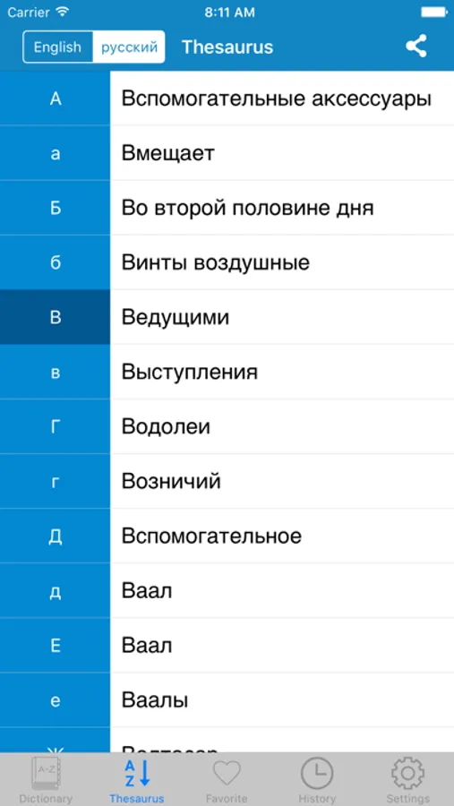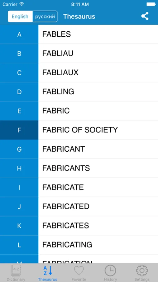 Other than the Russian to English translation and English to Russian translation, the app also brings you the history feature where you can find the meanings of your recently searched words as well as the Thesaurus feature where you can search English words as well as Russian words in alphabetical order and find out their meanings.