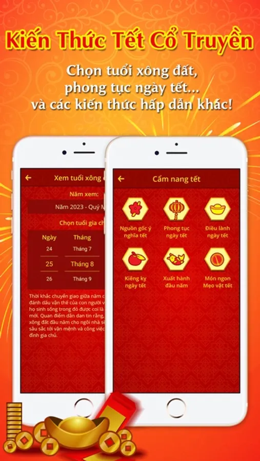 - Chọn tuổi xông đất: Tìm người phù hợp để xông đất đầu năm, giúp cho năm mới gặp nhiều may mắn và thuận lợi hơn