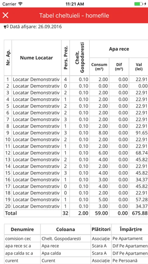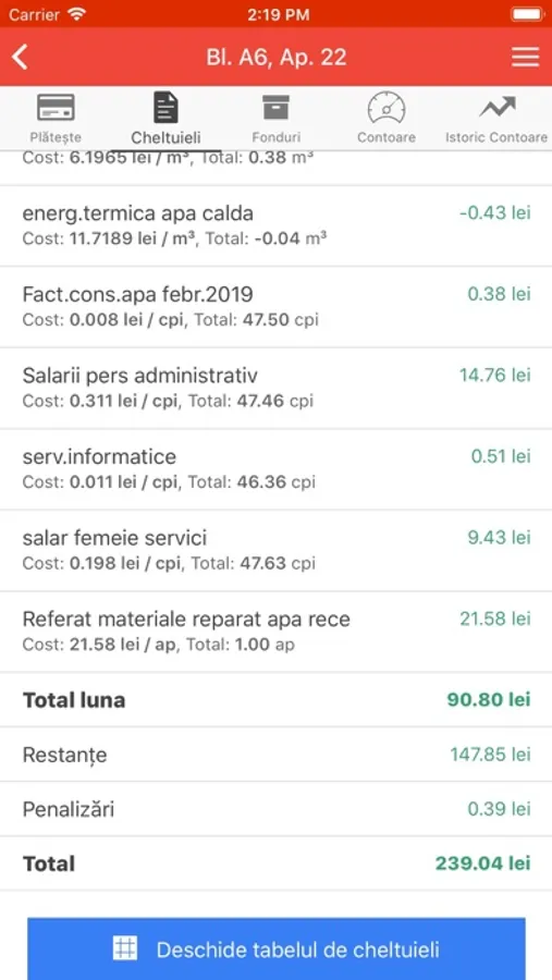 - Vizualizarea cheltuielilor detaliate ale locatarilor și imprimarea acestora