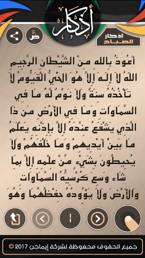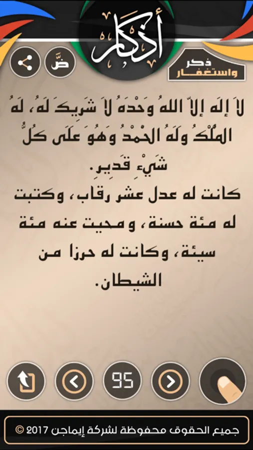 في شاشة الأذكار سوف يتم عرض عدد مرات القراءة لكل ذكر ويعمل زر العد على انقاص عدد مرات القراءة لكل ذكر او التحويل بشكل أتوماتيكي على الذكر التالي عند الانتهاء من قراءة الذكر الحالي