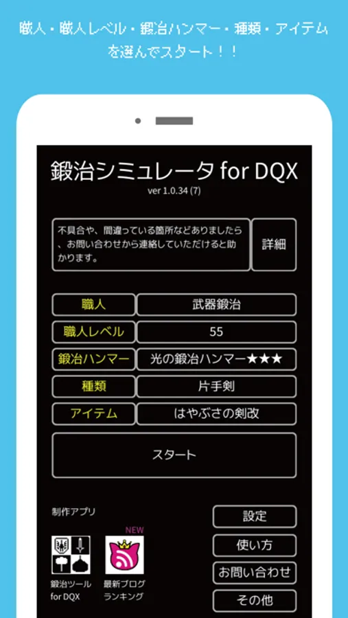 ドラクエ10の武器・道具・防具鍛冶職人のシミュレーションアプリです。