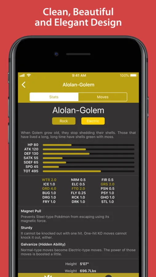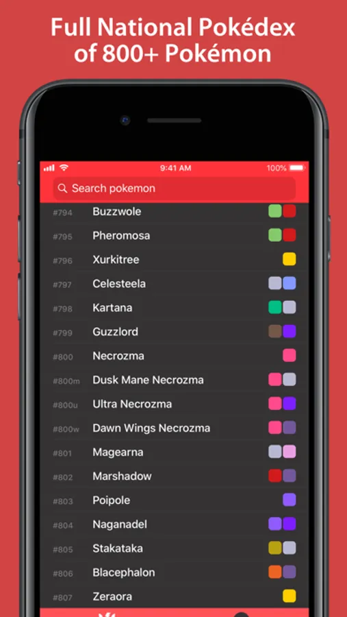 Full Pokédex for all Pokémons including new Pokémon from Pokémon Ultra Sun and Moon. All Alolan forms, Mega Evolutions, and event Pokémons are included. Get all the information of every Pokémon at your fingertips! No internet connection is required!