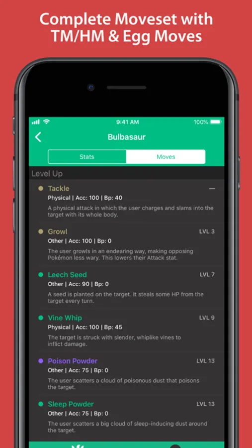 Browse each's Pokémon's abilities and complete moveset including Level Up Moves, TM/HM Moves, Egg Moves and Tutor Moves.