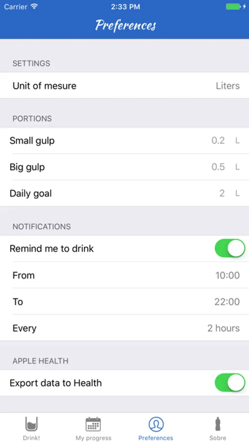 O BebaÁgua permite controlar o consumo diário de água de uma maneira simples e intuitiva: defina sua meta, defina sua parte usual e comece a acompanhar o aplicativo ou o widget no centro de notificações.