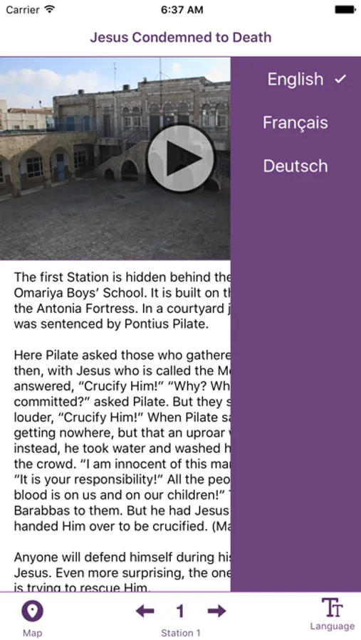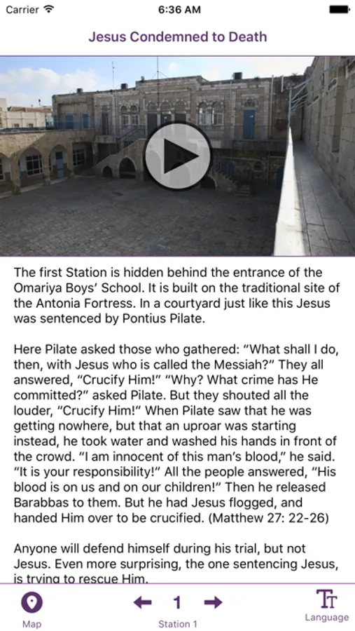 The way of the cross (Via Dolorosa) is a traditional pilgrim's route in Jerusalem that follows the last hours in the life of Jesus along 14 stations. Each station is introduced by a 2 minute inspirational video sequence, including Bible readings, prayers and thought for personal reflection. Every video takes you into the biblical narrative and helps you to reflect and pray on what happened here as it sparks your imagination with fascinating videography of the original sites.
