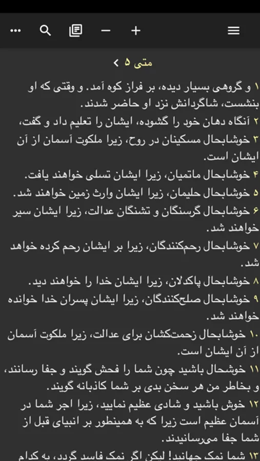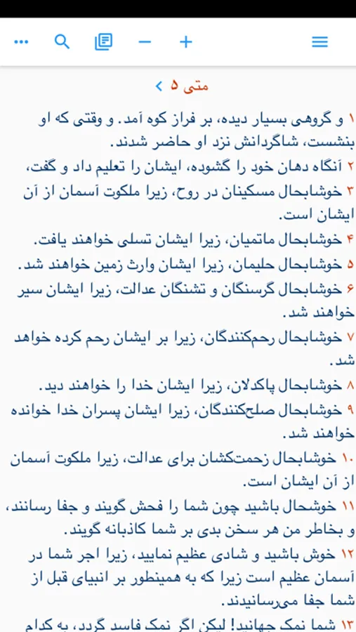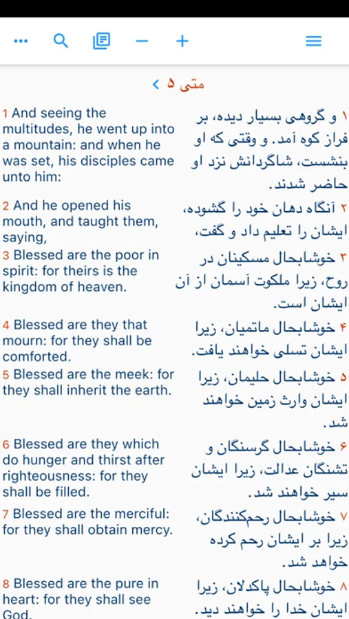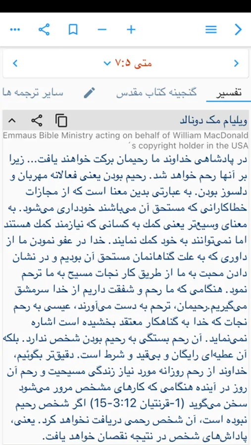Farsi Bible Study Center allows Users to read and search the Bible in Farsi. In addition to its advanced search features, Farsi Bible Study Center provides verse by verse commentaries by well known authors such as William MacDonald. Simply tap a verse to view a list of commentaries by author as well as Treasury of Scripture Knowledge (TSK) references. Users can also share verses on social media.