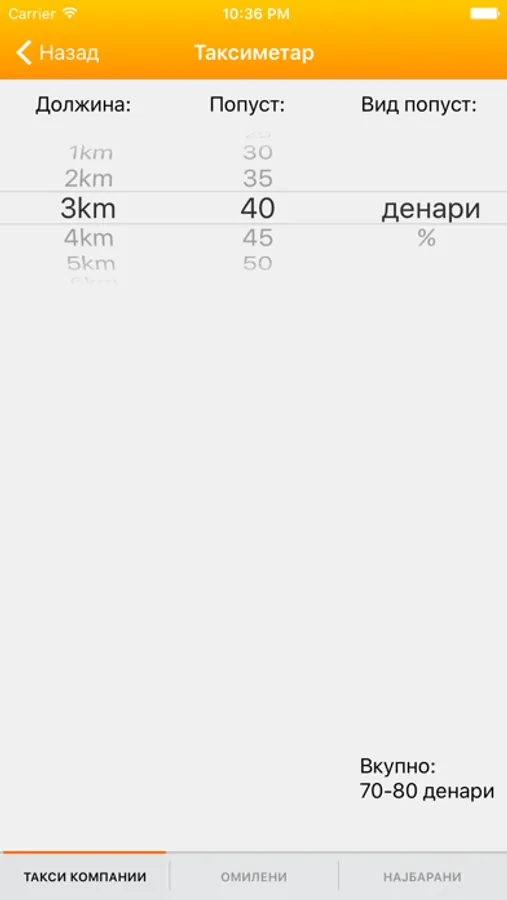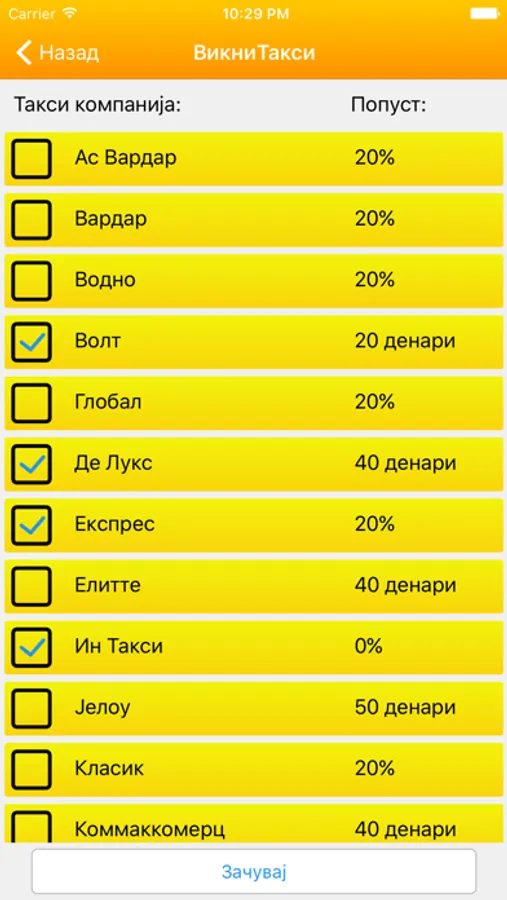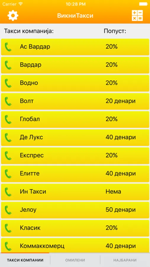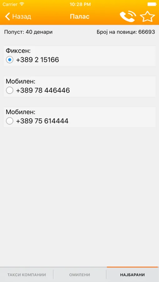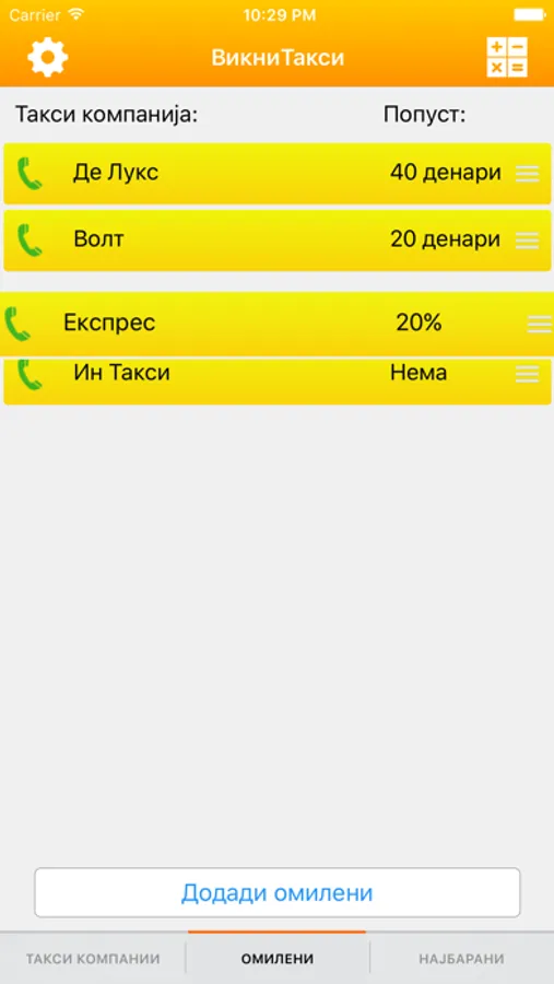 Има можност за додавање на неколку омилени такси компании и нивно брзо повикување.