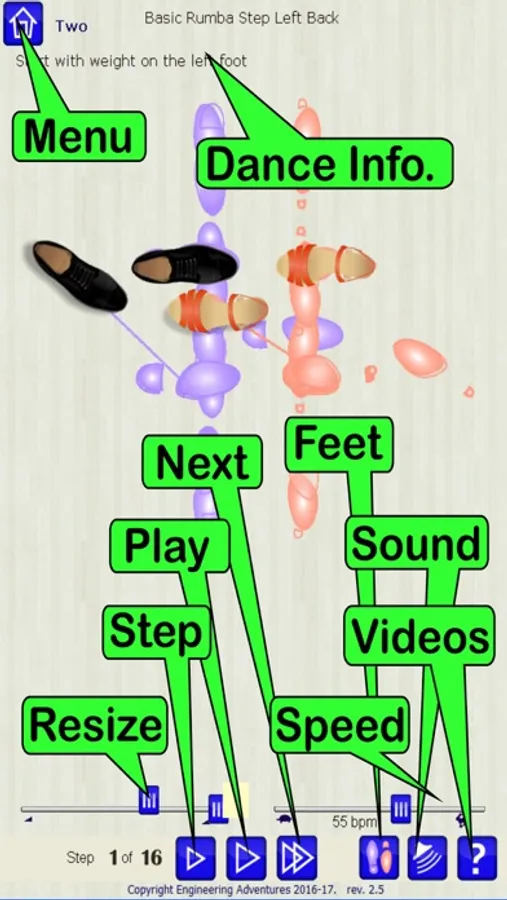 The steps are displayed clearly on your phone, just as if they were drawn out on the floor in front of you. Zoom out to see the whole dance routine or simply follow the position of the next dance step shown in front of you.