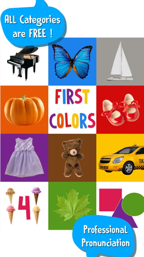 - There are 11 flashcard categories and more than 110 words (Numbers, Shapes and 9 Colors - red, green, blue, brown, yellow, orange, purple, black, white).