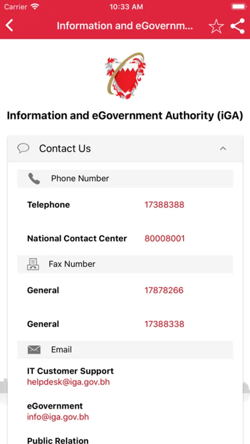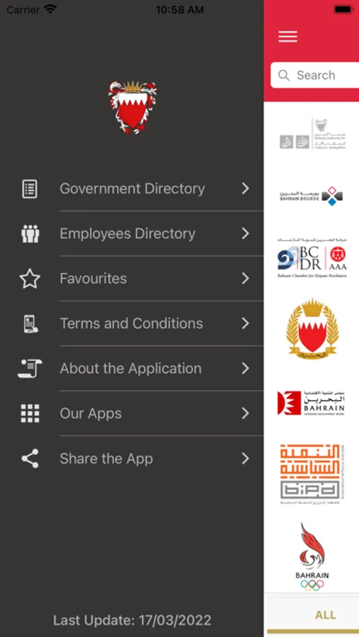 This application provides a list of Government Entities in the Kingdom of Bahrain that includes the employees details, contact details, social media accounts and the location for each entity on an interactive map. It also enables the users to search for a specific Government Entity or its employees, in addition to the facility of calling, sending emails, adding contact to phone address book or mark it as a favorite.
