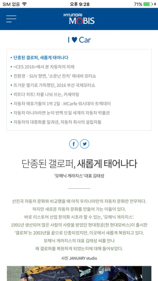 현대모비스 소식과 자동차와 자동차부품 그리고 풍성한 교양 문화 정보를 담은 품격있는 앱 매거진의 세계로 안내합니다.
