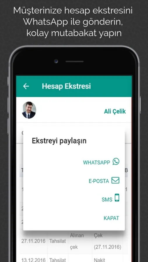 • Ayrıca tek tıkla hesap ekstresi oluşturabilir, müşteri veya tedarikçinize online mutabakat mektubunu Whatsapp/SMS/e-mail yolu ile gönderebilirsiniz.