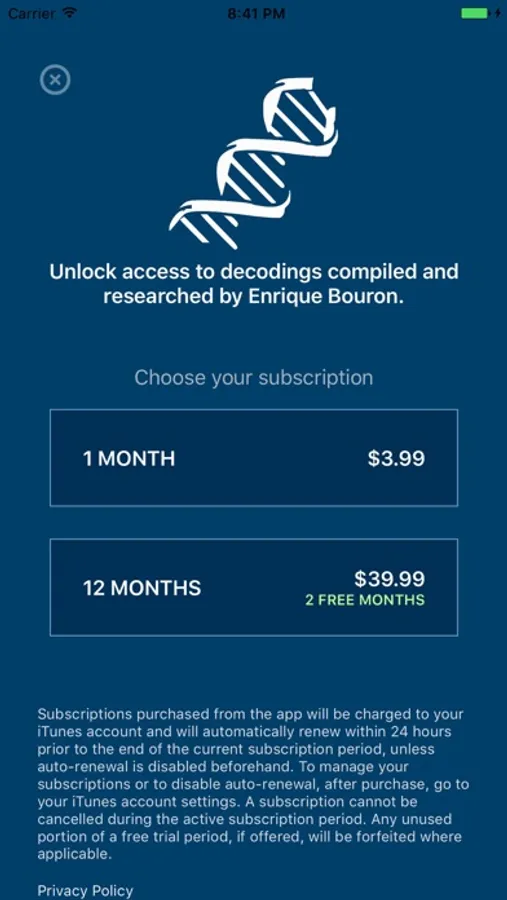 To make an in-app purchase of Biological Decoding subscription, open the app. In the decoding details tap GET YOUR SUBSCRIPTION. Subscriptions begin at from $3.99 a month in the US, and can vary by region. With a Biological Decoding subscription you have access to all conflicts associated with behaviors and diseases as well as the conflicting meaning related to each organ and system of the body.