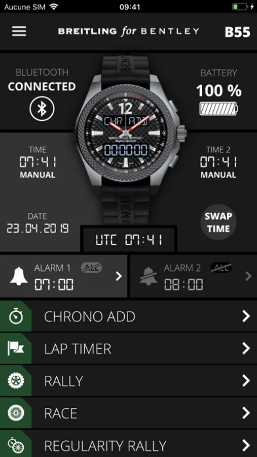 • Check the state of your chronograph at a glance and adjust your settings (UTC time, timezones, date, 7 alarms, synchronization of the hands).