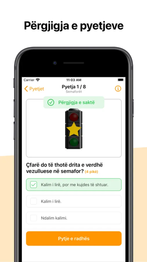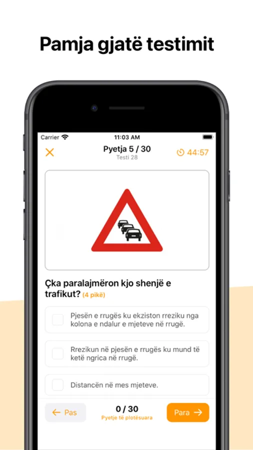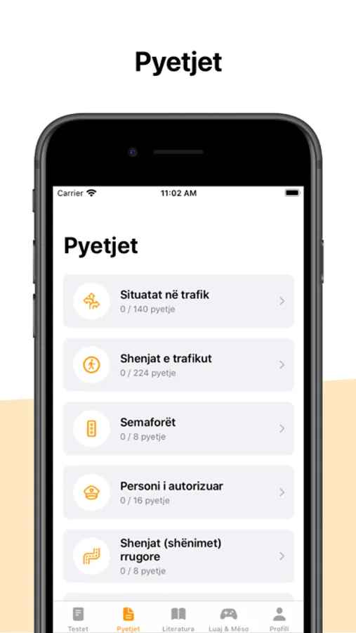 Aplikacioni përmban një koleksion të gjerë të testeve dhe pyetjeve të ndara në kategori për secilën kategori të patentës shofer. Ju do të keni mundësinë të praktikoni njohuritë tuaja duke zgjidhur pyetjet e testimeve dhe të merrni rezultate të menjëhershme. Kjo ju ndihmon të përgatiteni në mënyrë efektive për provimet e patenteve shofer. Përmes testeve dhe pyetje të ndryshme do të keni shumë të lehtë përgatitjen e Testit Final.