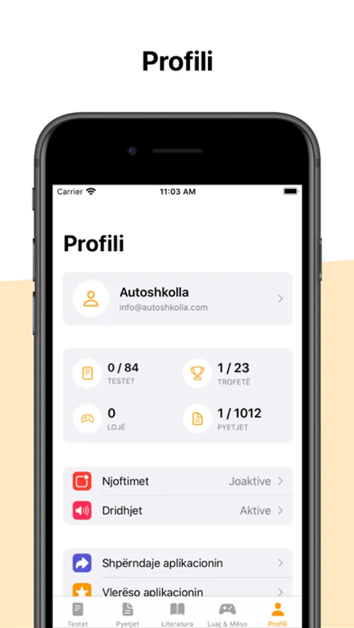 Përmes krijimit të një profili personal në aplikacion, ju do të keni mundësinë të ndiqni përparimin tuaj në mesim dhe testim. Profili juaj ruaj statistikat e testeve të kaluara dhe rezultatet e arritura, duke ju ndihmuar të vlerësoni zhvillimin tuaj dhe të identifikoni fushat që kërkojnë përmirësim.
