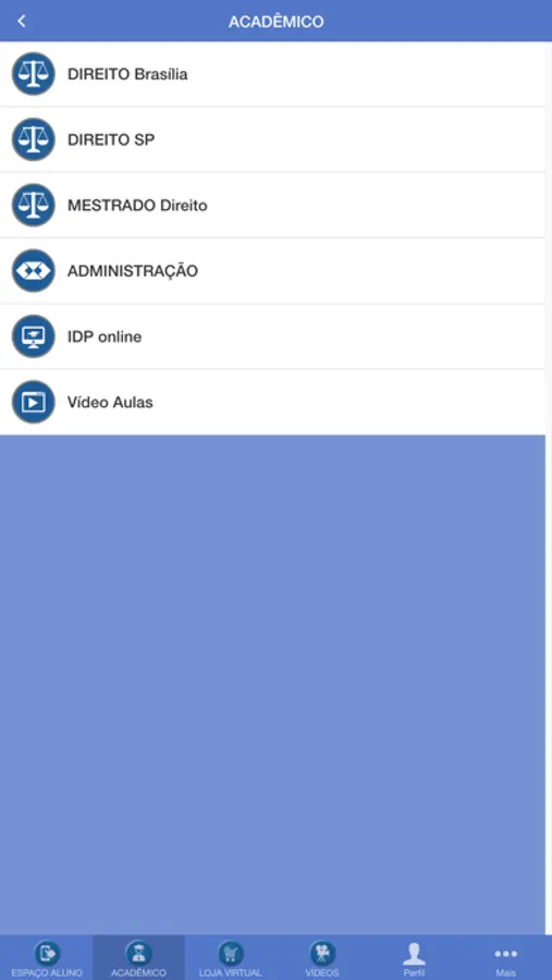 Espaço Aluno. Acadêmico. Loja virtual. Vídeos. IDP Acontece. Redes Sociais. Contatos.